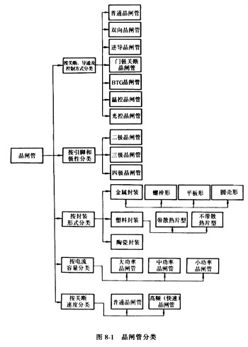晶闸管是晶体闸流管(Thyristor)的简称,谷称可控硅,它是一种大功率开关型半导体器件,在电路中用文字符号为“V”、“VT”表示(旧标准中用字母“SCR”表示)。 晶闸管具有硅整流器件的特性,能在高电压、大电流条件下工作,且其工作过程可以控制、被广泛应用于可控整流、交流调压、无触点电子开关、逆变及变频等电子电路中。 一、晶闸管的种类 晶闸管有多种分类方法。 (一)按关断、导通及控制方式分类 晶闸管按其关断、导通及控制方式可分为普通晶闸管、双向晶闸管、逆导晶闸管、门极关断晶闸管(GTO)、BTG晶闸管、温控晶闸管和光控晶闸管等多种。 (二)按引脚和极性分类 晶闸管按其引脚和极性可分为二极晶闸管、三极晶闸管和四极晶闸管。 (三)按封装形式分类 晶闸管按其封装形式可分为金属封装晶闸管、塑封晶闸管和陶瓷封装晶闸管三种类型。其中,金属封装晶闸管又分为螺栓形、平板形、圆壳形等多种;塑封晶闸管又分为带散热片型和不带散热片型两种。 (四)按电流容量分类 晶闸管按电流容量可分为大功率晶闸管、中功率晶闸管和小功率晶闸管三种。通常,大功率晶闸管多采用金属壳封装,而中、小功率晶闸管则多采用塑封或陶瓷封装。 (五)按关断速度分类 晶闸管按其关断速度可分为普通晶闸管和高频(快速)晶闸管。 图8-1是晶闸管的分类图,图8-2是晶闸管的外形,图8-3是晶闸管的电路图形符号。 |